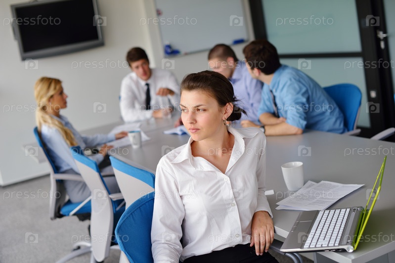 Бизнес-леди в офисе с коллегами на заднем плане