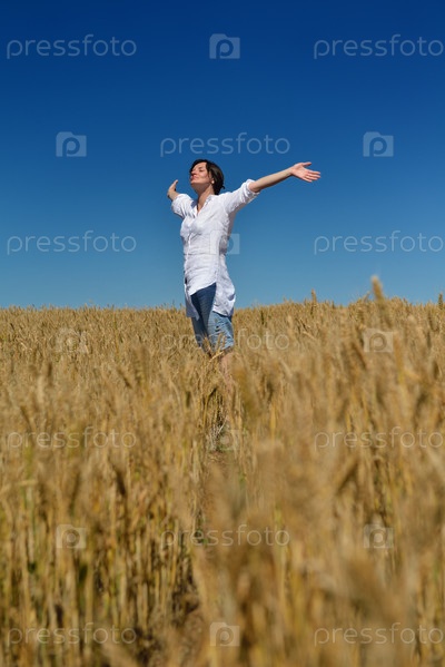 Молодая женщина в поле пшеницы летом