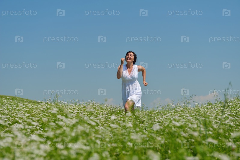 Молодая счастливая женщина на зеленом поле