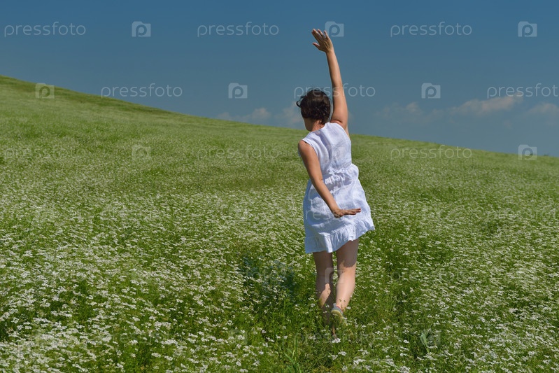 Молодая счастливая женщина на зеленом поле