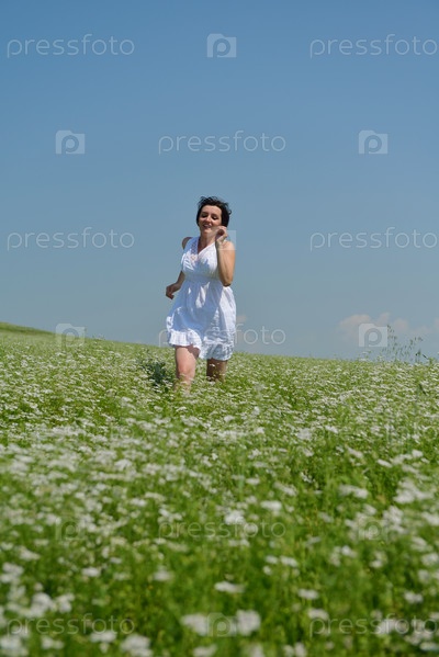 Молодая счастливая женщина на зеленом поле