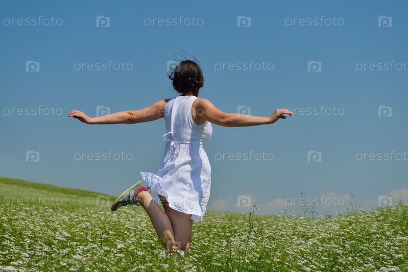 Молодая счастливая женщина на зеленом поле