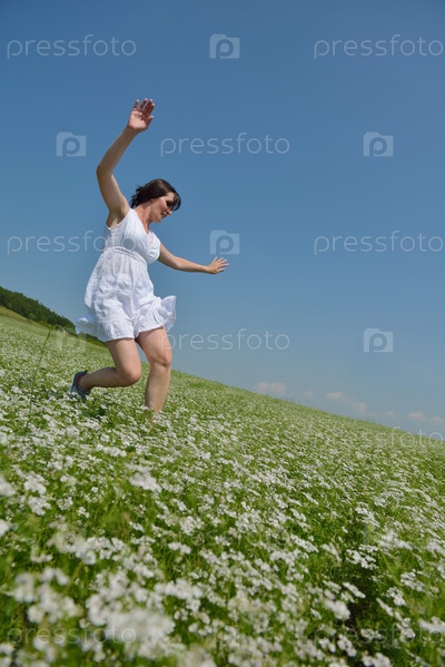 Молодая счастливая женщина в зеленом поле