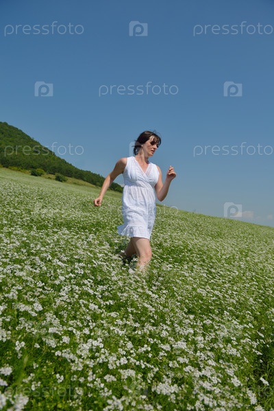 Молодая счастливая женщина в зеленом поле