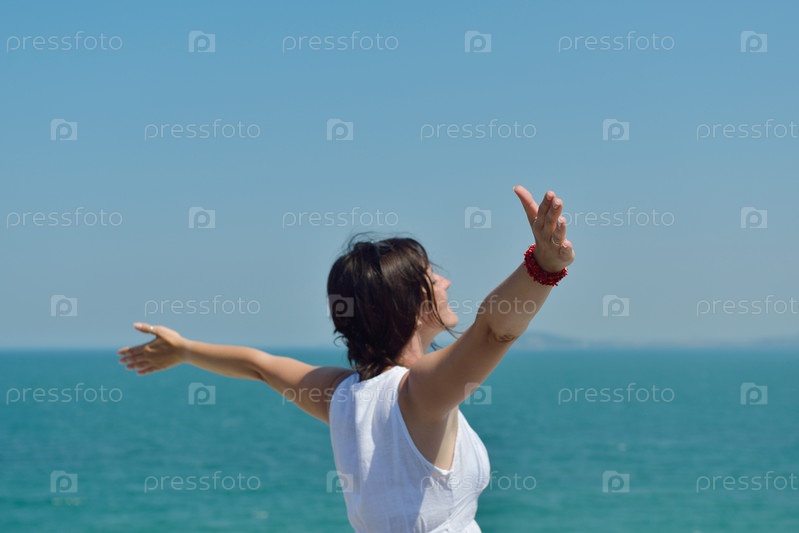 Счастливая молодая женщина стоит, подняв руки к небу