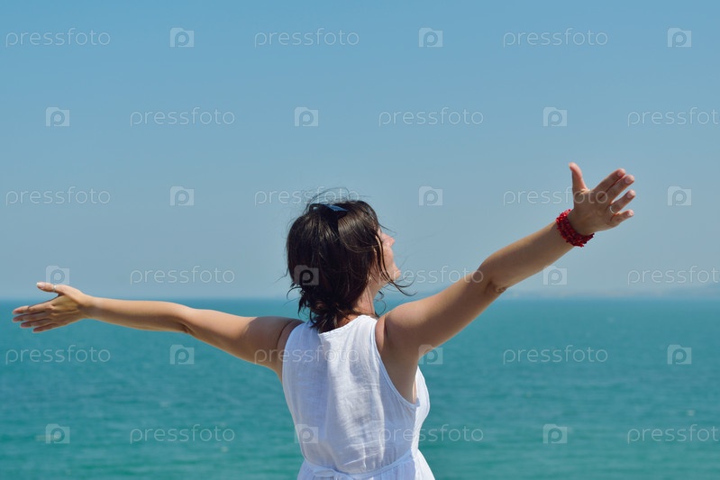 Счастливая молодая женщина стоит, подняв руки к небу