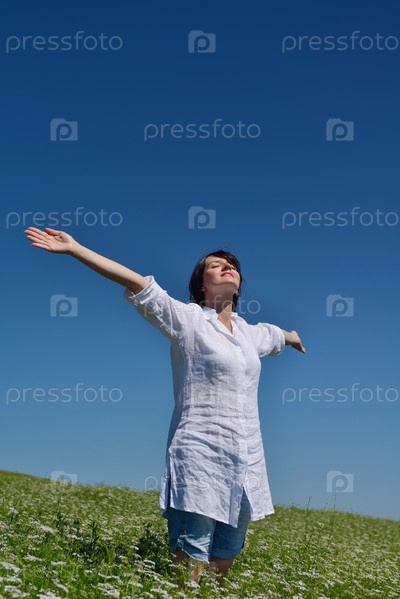 Молодая счастливая женщина на зеленом поле