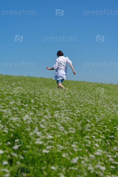 Молодая счастливая женщина на зеленом поле