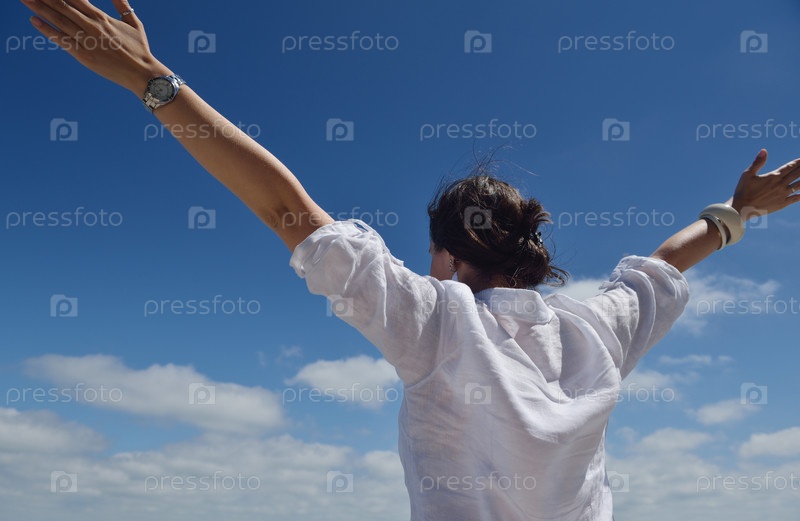 Счастливая молодая женщина с поднятыми в небо руками