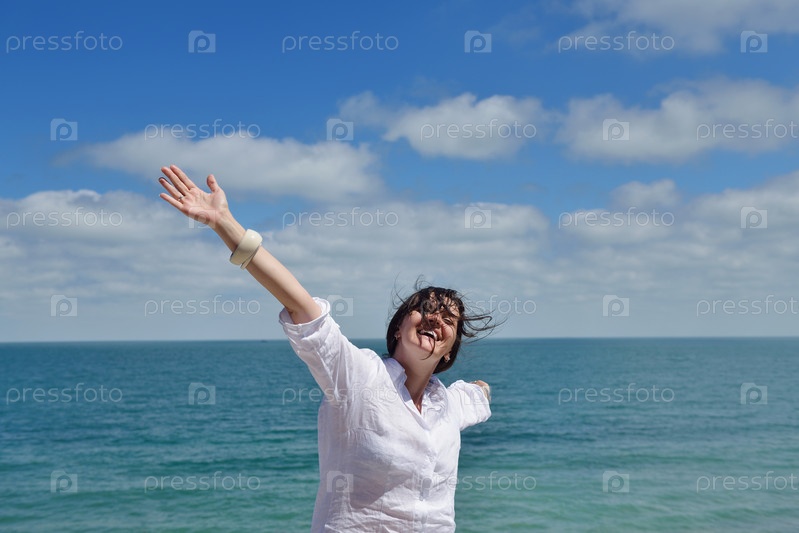 Счастливая молодая женщина с поднятыми в небо руками