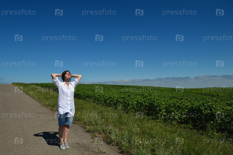 Молодая счастливая женщина на зеленом поле