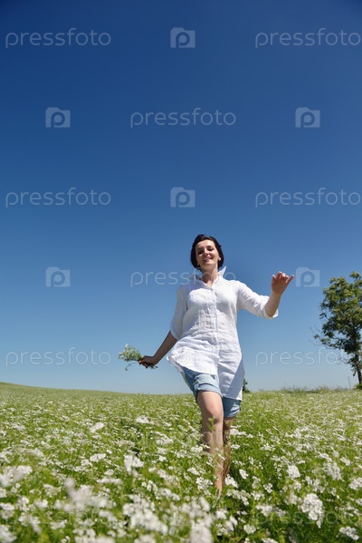 Молодая счастливая женщина на зеленом поле