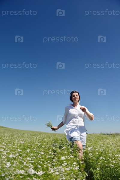 Молодая счастливая женщина на зеленом поле