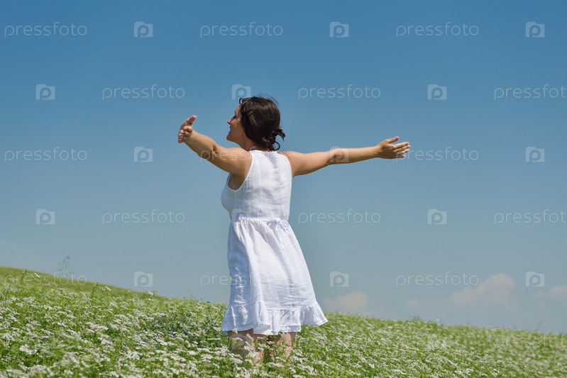 Счастливая молодая женщина с поднятыми в небо руками