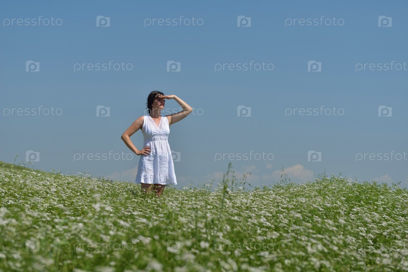 Молодая счастливая женщина в зеленом поле