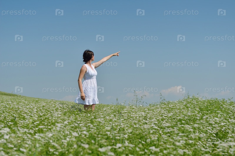 Молодая счастливая женщина в зеленом поле