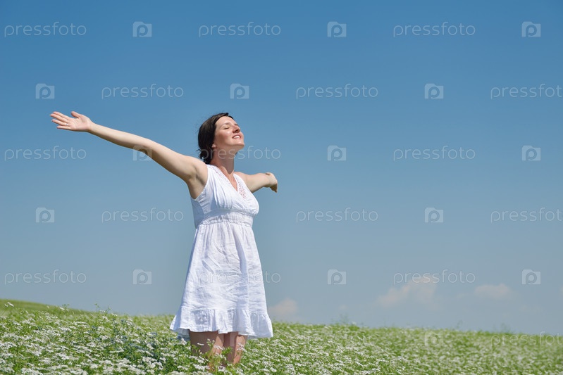 Молодая счастливая женщина в зеленом поле