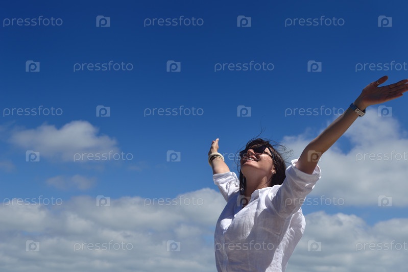 Счастливая молодая женщина стоит, подняв руки к небу