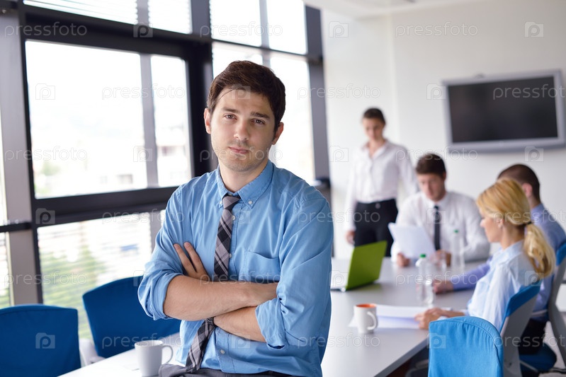Бизнесмен на встрече в офисе с коллегами на заднем плане