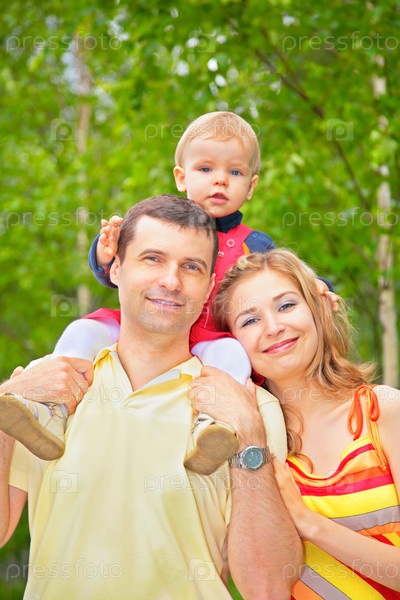 Сын сидит на плечах у отца в парке