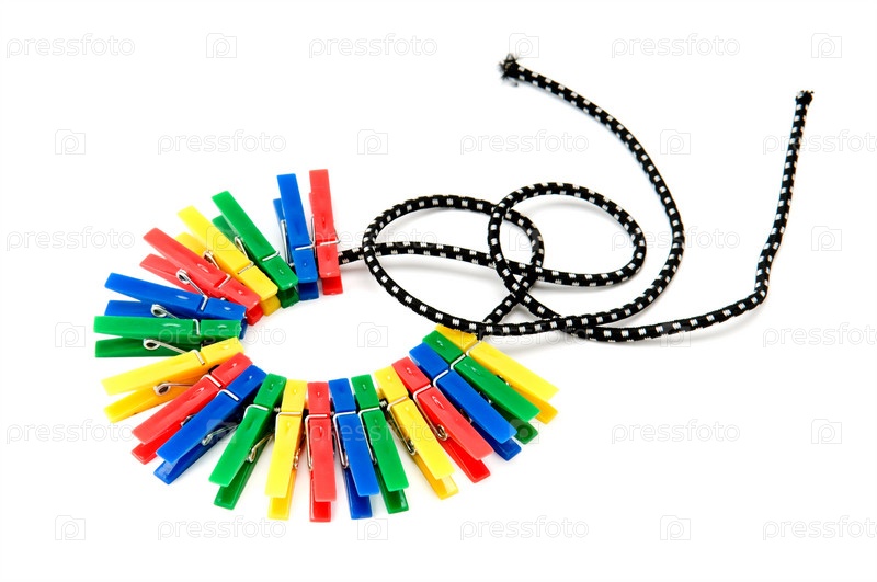 Прищепки на веревке, изолированные на белом фоне