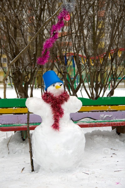 Снеговик с ведром и в шарфе с мишурой