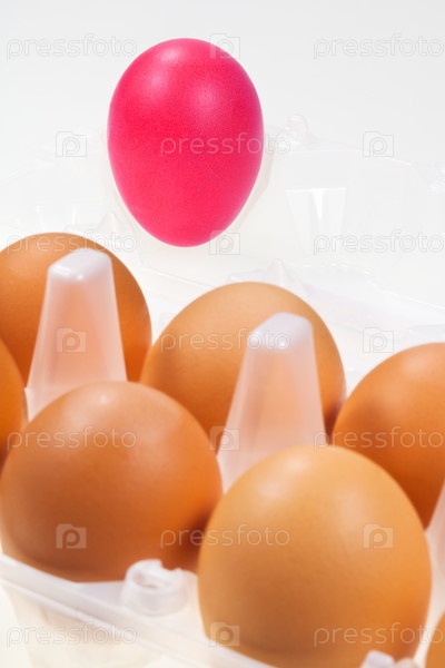 Красное куриное яйцо и несколько коричневых яиц