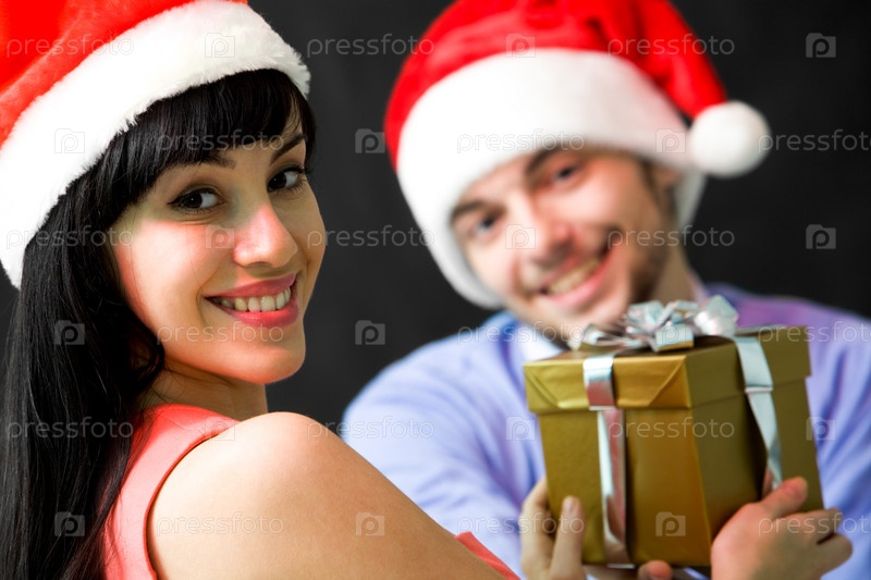 Изображение счастливой женщины, дающей мужчине подарок