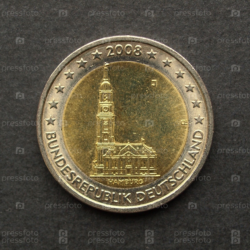 Монета номиналом 2 евро с Гамбургской церковью