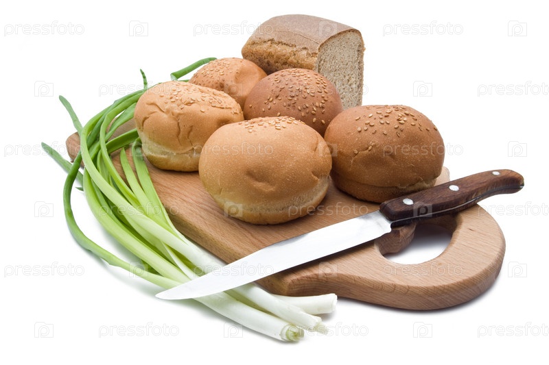 Различные виды хлеба и зеленый лук, изолированные на белом