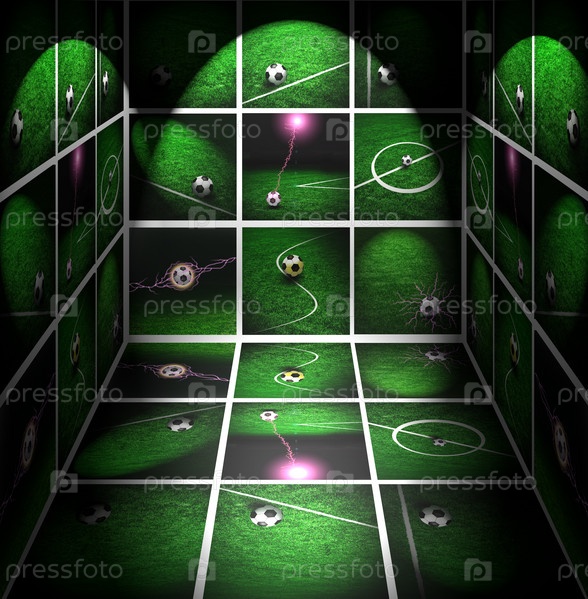 Комната с коллажем из плакатов с футбольным мячом на газоне стадиона