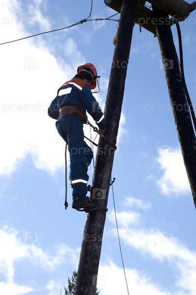 Электрик поднимается на опору линии электропередачи