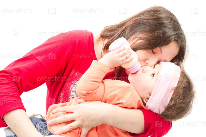 Мать кормит своего ребенка детской смесью из бутылочки. Концепция детства и семьи