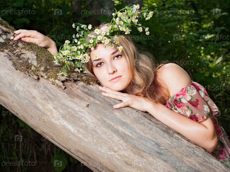 Красивая девушка в национальном костюме и венке в лесу