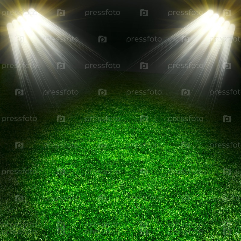 Футбольный мяч на зеленом поле с освещением