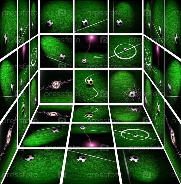 Комната с большим коллажем из плакатов с футбольными стадионами и мячами