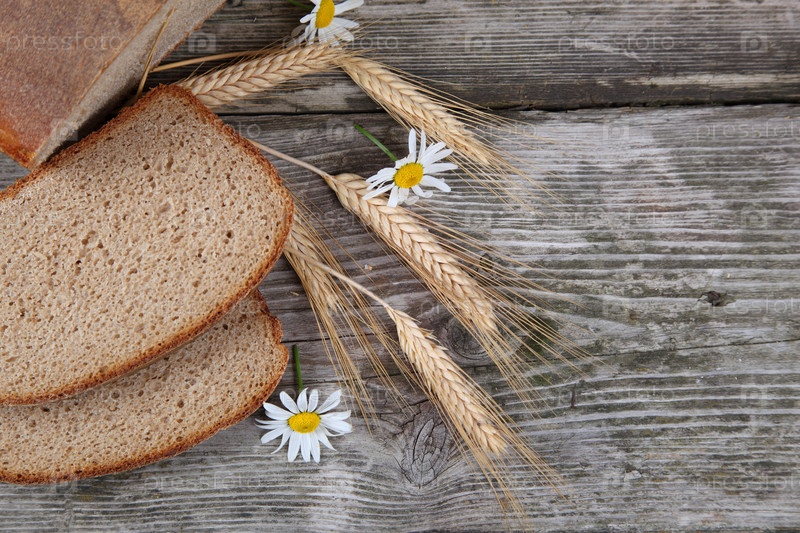 Хлеб, колосья и ромашки на деревянной доске