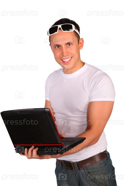 Молодой парень с ноутбуком на белом фоне