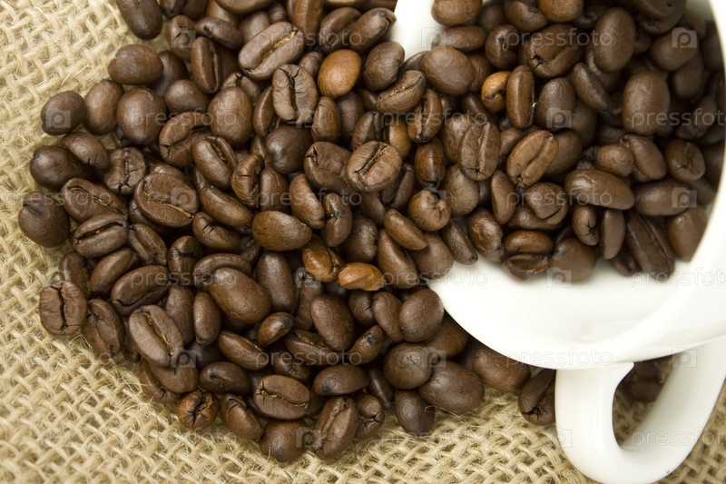 Кофейные зерна, высыпанные из белой чашки