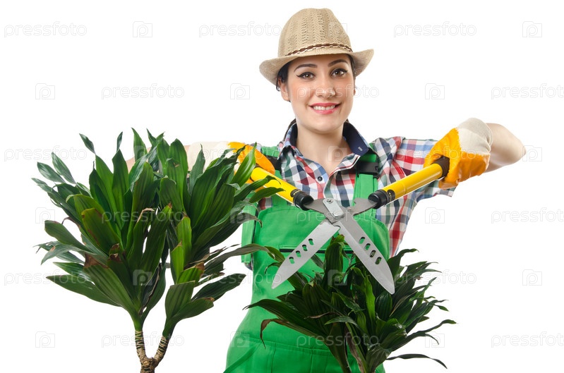 Женщина-садовник обрезает растения на белом фоне