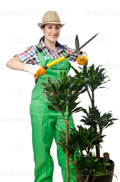 Женщина-садовник обрезает растения на белом фоне