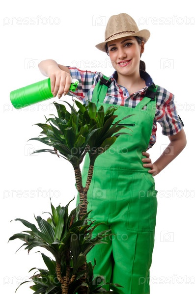 Девушка поливает растения на белом фоне