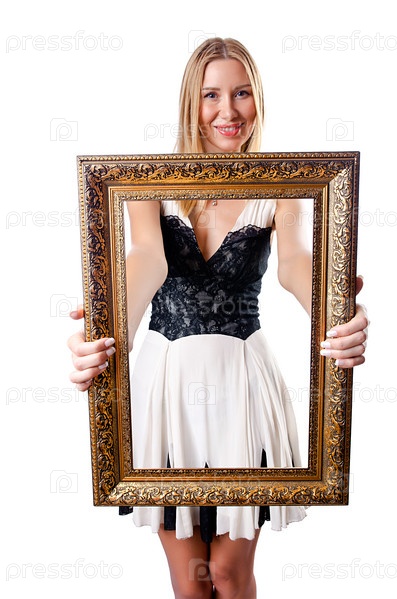 Молодая женщина с фоторамкой на белом фоне