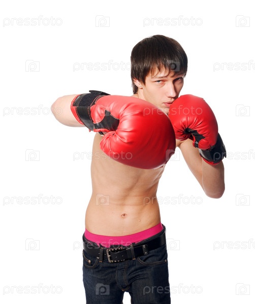 Красивый молодой человек, одетый в боксерские перчатки на белом фоне