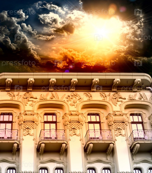 Старинное здание с пожарным выходом в Одессе, на фоне красивого красного заката