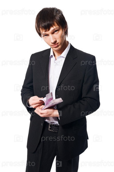 Красивый молодой человек, одетый в деловой костюм на белом фоне