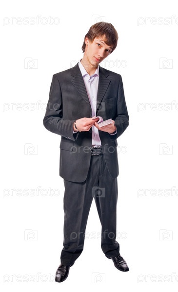 Красивый молодой человек, одетый в деловой костюм на белом фоне