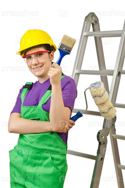 Женщина с лестницей на белом фоне