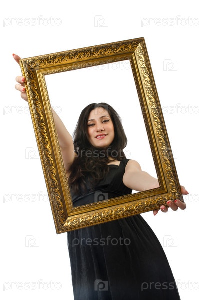 Женщина с фоторамкой на белом фоне
