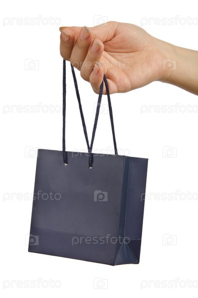 Рука с подарочным пакетом на белом фоне